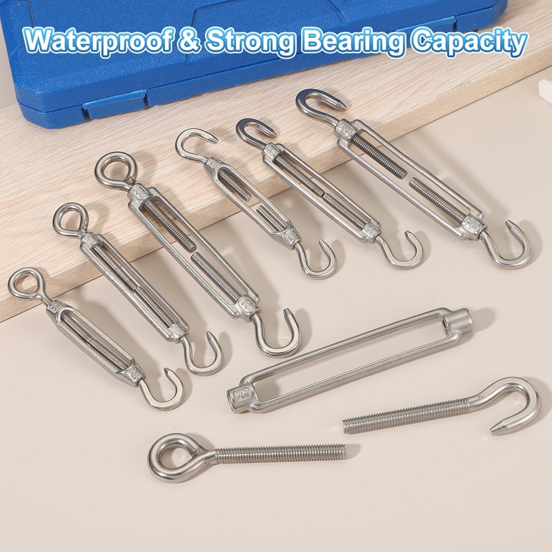- Quick Installation: The hook-and-eye configuration simplifies setup without requiring tools; Simply attach the hooks to the link point and rotate the turnbuckle body to adjust tension and tighten the cable or rope