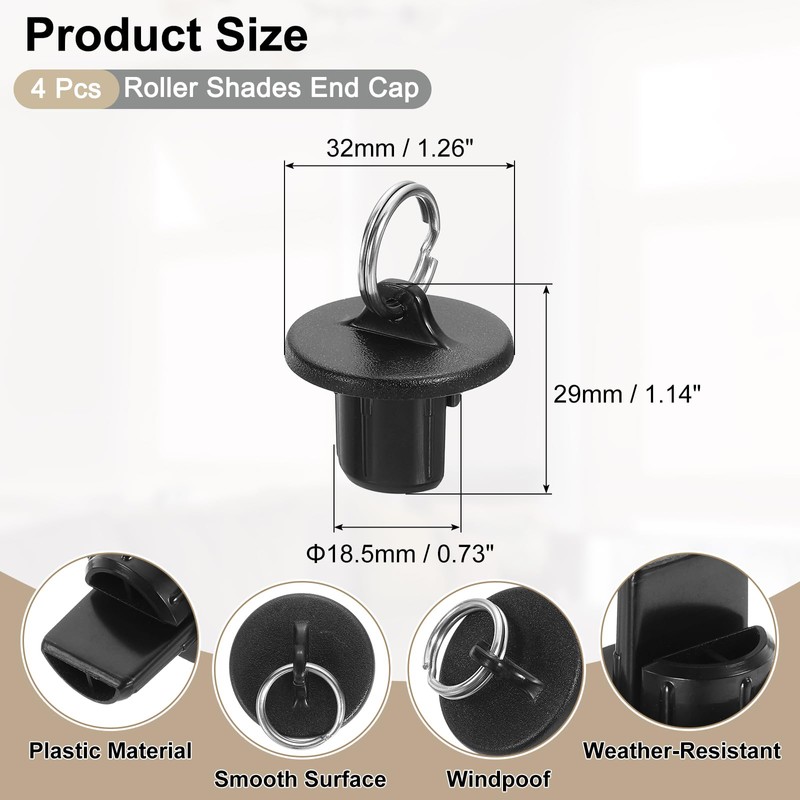- [SIZE & PACKAGING]: The size of the roller shades end cover is 32 x 29mm / 1.26" x 1.14" (W x H), the suitable installation diameter is 18.5mm/0.73", and the package includes 4pcs of roller shades end cap