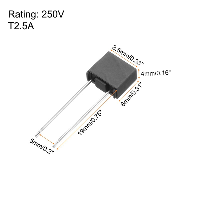- Fuse Type: Slow Acting Blow (Time Delay);Material: Electronic Parts, Metal;Color: Black;Rating: 250V, T2.5A;Body Size: 8.5 x 8 x 4 mm / 0.33 x 0.31 x0.16 Inch (Lx W x H);Pin Length: 19mm / 0.75";Pin Distance: 5mm / 0.2";Package Content:50 Pcs x Slow Blow Micro Fuse