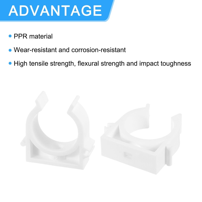 Material: The pipe clamp is made of PPR material, which is a thermoplastic that is odorless, wear-resistant, corrosion-resistant, and resistant to high and low temperatures. It has high tensile strength, bending strength and impact toughness, and has a long service life.