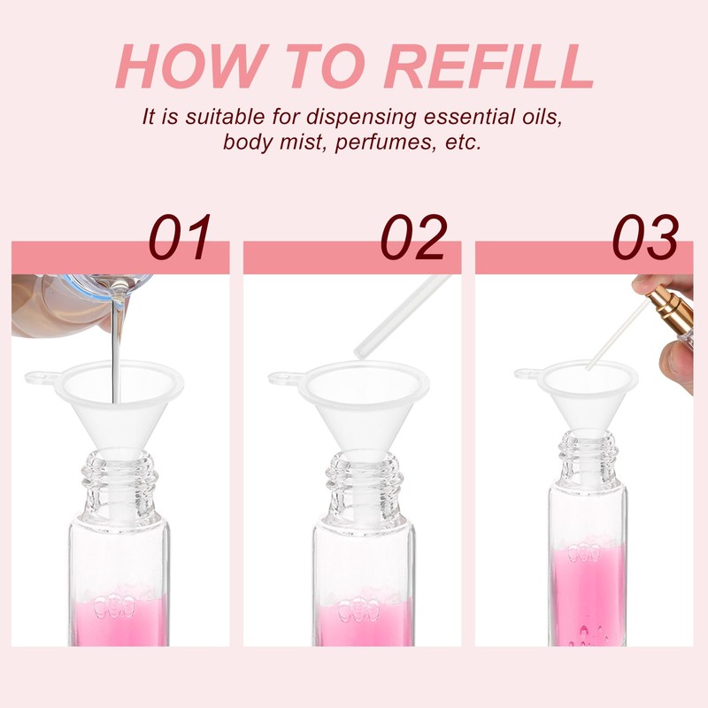 - How to Refill: Twist off the cap, pour the liquid into the bottle, and close the cap, making it easy to refill the perfume bottles with your preferred fragrance. Then Press the pump to squeeze out the solution.
