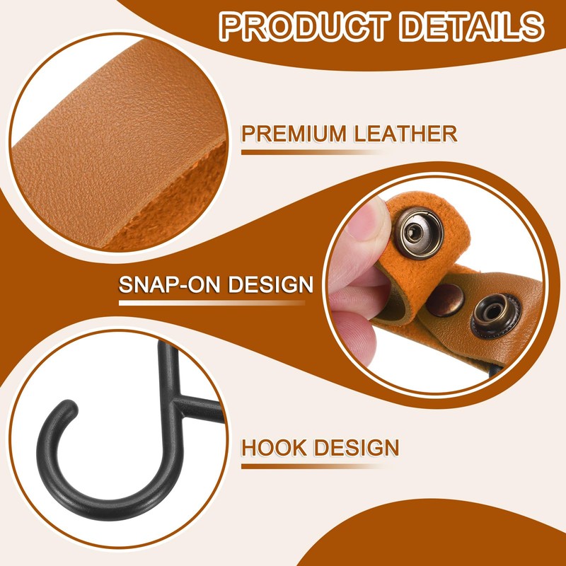• [Easy To Use] - Open the leather strap snap button, fasten it on the shelf, or loop it around a pole, and hang your item on the hook.
