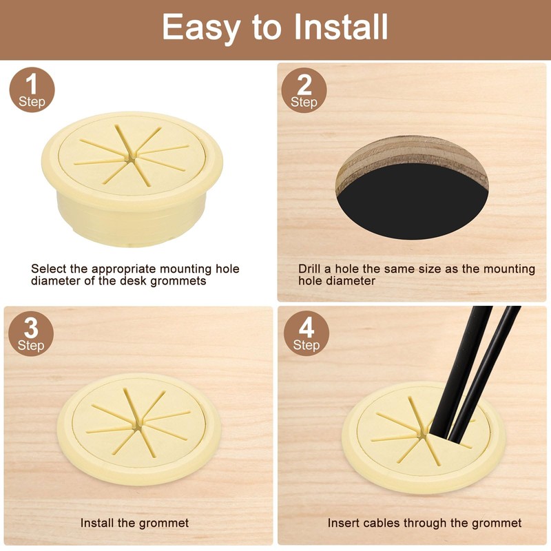 Easy Installation: Measure the diameter of the desktop hole, select the proper mounting hole diameter for the desktop grommet, and then press the grommet firmly into the closure to complete the installation