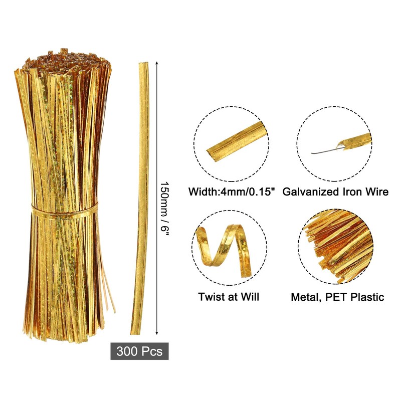 uxcell 6" Twist Ties, Metallic Twist Ties, Reusable Plastic Coated Twist Ties for Bakery, Candy Bags, Coffee Bags, Goodie Bags, Pack of 300, Shiny Gold