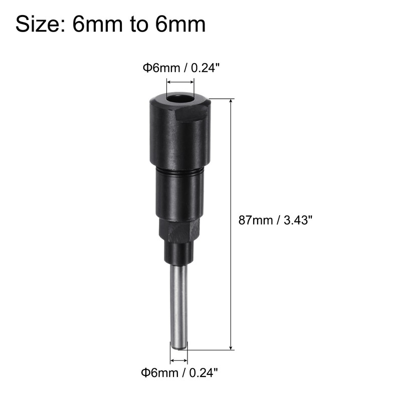 - Router Collet Extension Size: Shank Diameter : 6mm / 0.24", Accept Shank Diameter: 6mm / 0.24", Total Length: 87mm / 3.43". Made of durable carbon steel, ensuring its high strength, high hardness, wear resistance and vibration resistance.