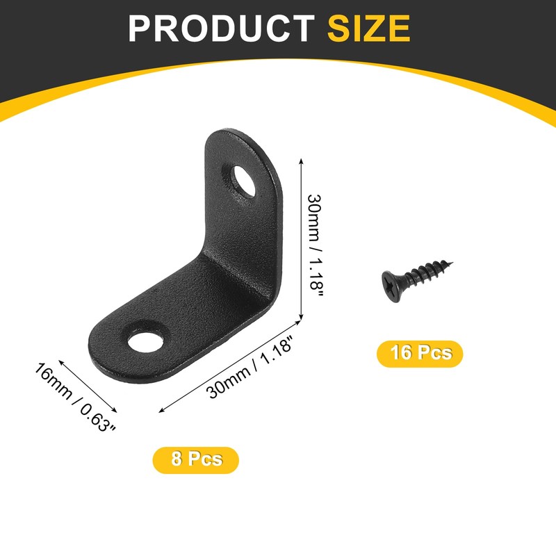 - Colour: Black; Material: Metal; Surface Treatment: Spraying; Overall Size: 30mm x 30mm x 16mm / 1.18" x 1.18" x 0.63"(L*W*H); Thickness: 2mm / 0.08"; Package Contents: 8Pcs x L Brackets Corner Brace (16Pcs x Self-tapping Screws)