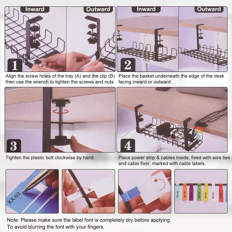 Package Content: 1Pcs x Cable Management Tray, 4Pcs x Desktop Cable Fixer, 4Pcs x Hook and Loop, 8Pcs x Cable Label(Colors: Blue, Yellow, Orange, Purple, Green, White, Light Blue, Red), 5Pcs x Screws, 5Pcs x Nuts, 1Pcs x Hex Wrench, 1Pcs x Open-end Wrench