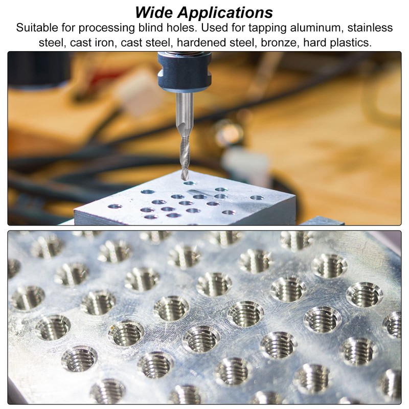 • Wide Applications: Suitable for processing blind holes. Used for tapping aluminum, die steel, stainless steel, bronze, hard plastics, etc.. Recommended feed rate: general steel: 6-15m/min; harder steel: 5-10m/min; stainless steel: 2-7m/min; cast iron: 8-10m/min.
