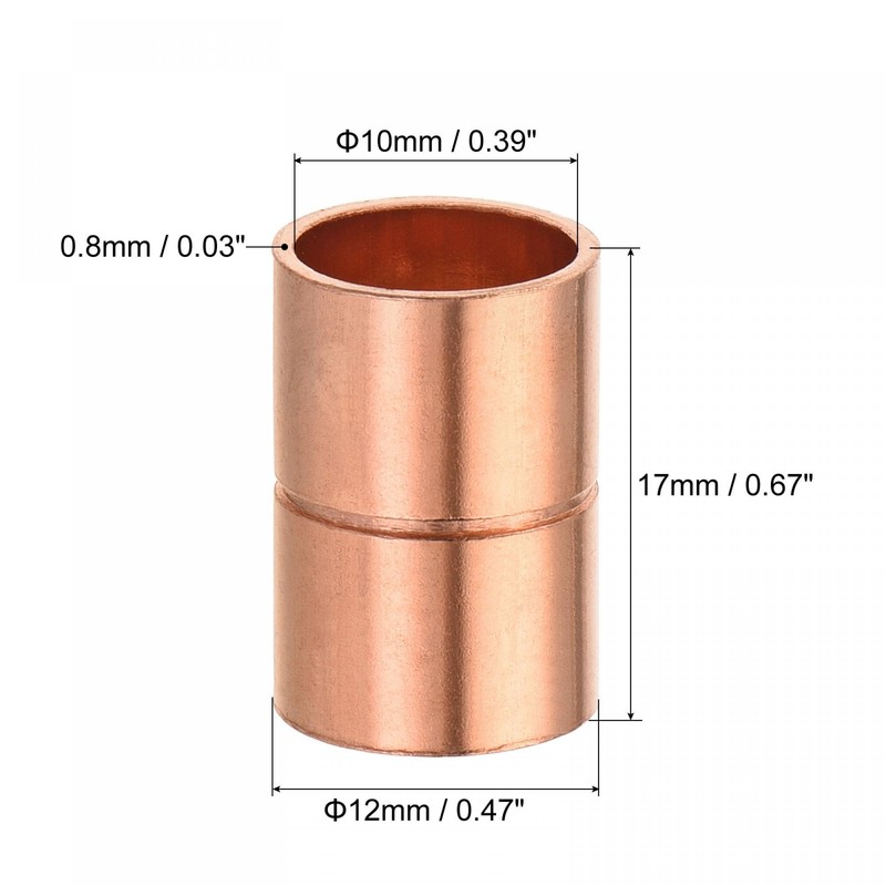 - Material: Copper; Color: Copper Tone Total Length: 0.7 inches (17 mm); Thickness: 0.03 inches (0.8 mm); Outer Diameter: 0.5 inches (12 mm); Inner Diameter: 0.4 inches (10 mm); Package: 2 x copper pipe couplings