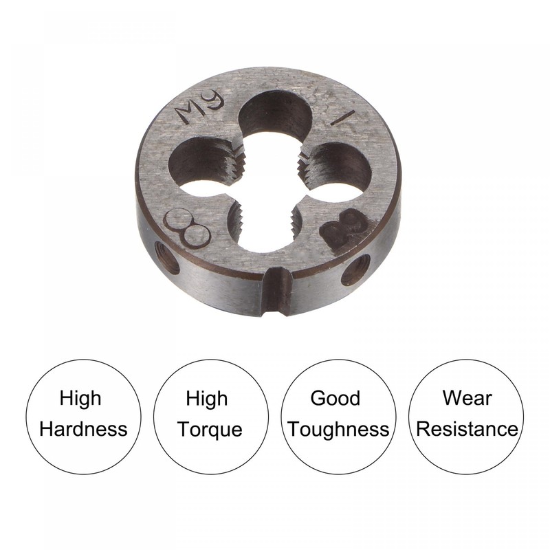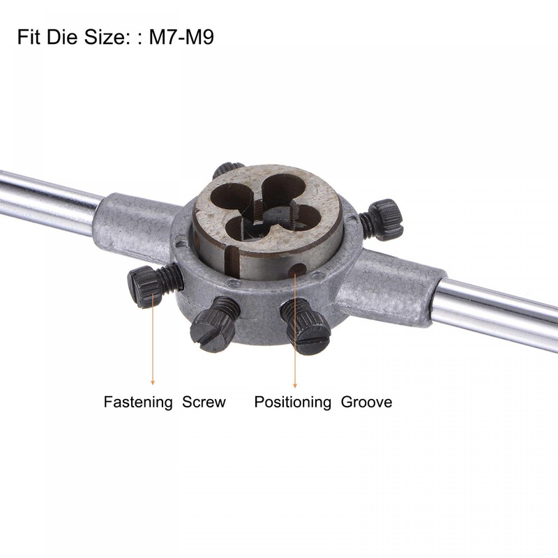 - Die Stock Wrench Set: 25mm die stock fits M7-M9 dies, with adjustable screws. M9 x 1 threading round die with 25mm outside diameter, conical locking hole, strong locking and not loose. The round die has good abrasion resistance.
