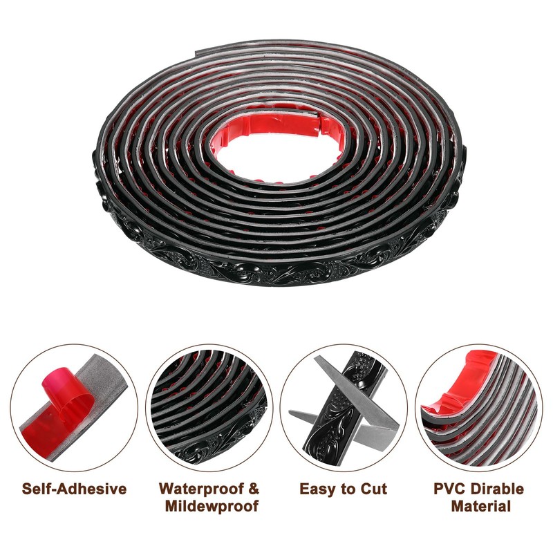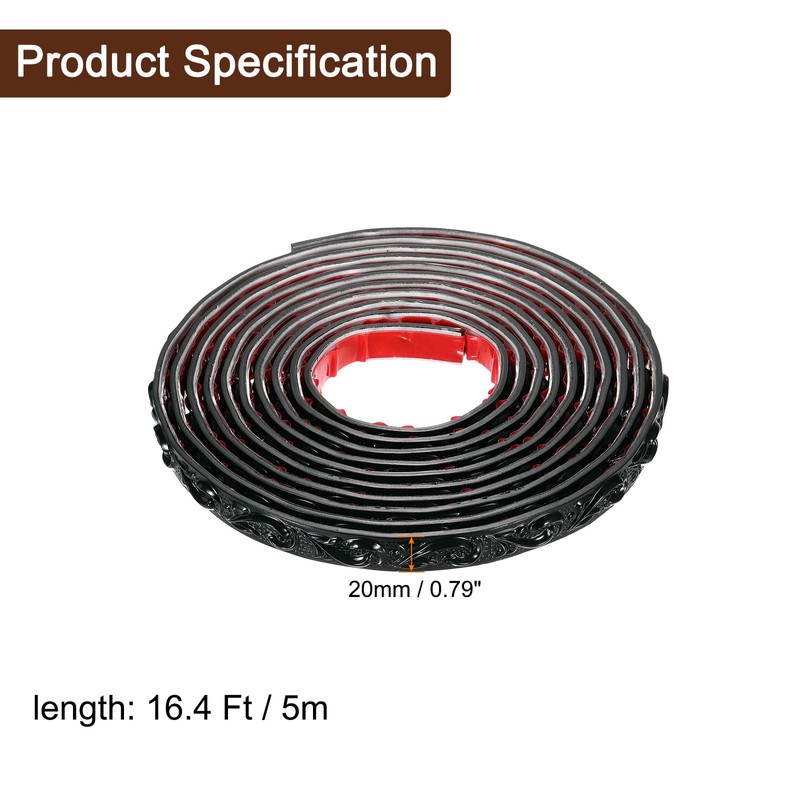 - [3D Wall Trim Molding Trim]:Color: Black; Material: PVC; Size: 5m x 20mm / 16.4Ft x 0.79Inch (L*W); Package Content: 1 Pcs x Self Adhesive Wall Trim Molding