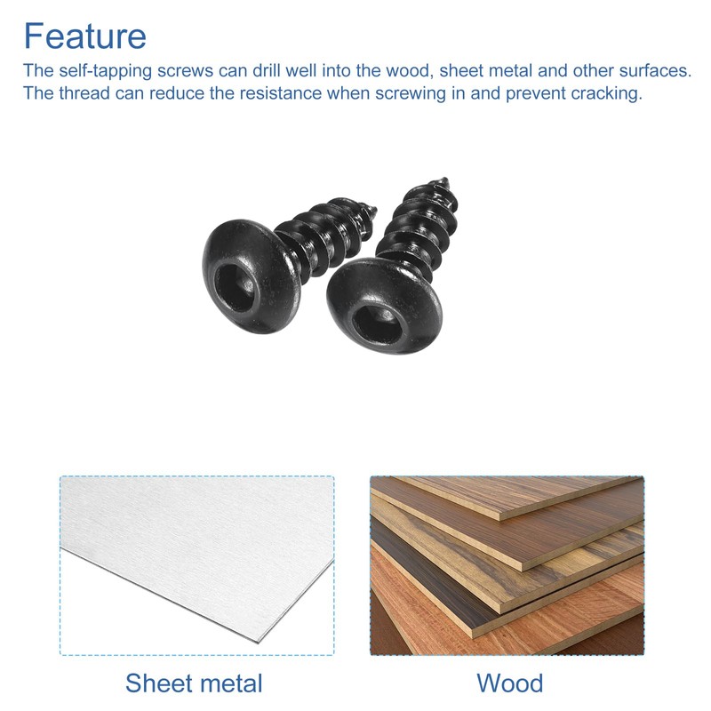 The self-tapping screws can drill well into the wood, sheet metal and other surfaces. The thread can reduce the resistance when screwing in and prevent cracking.