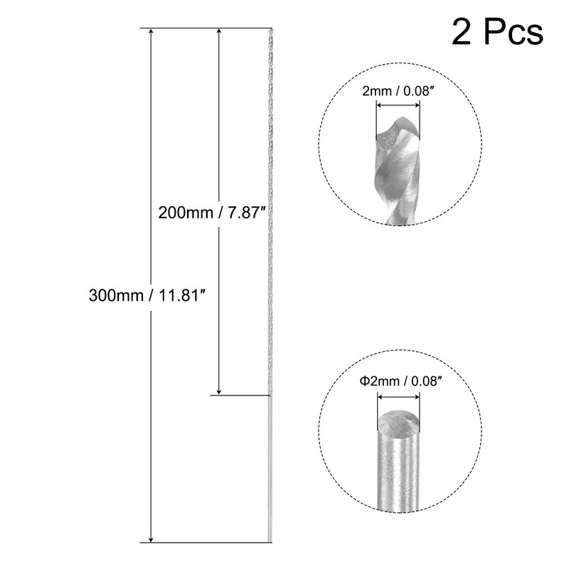 - [Specifications]- Twist Drill Bits Diameter: 2mm / 0.08-inch; Drill Bit Length:200mm / 7.87-inch; Shank Diameter: 2mm / 0.08-inch; Total Length: 300mm / 11.81-inch; 2 x Straight Shank Twist Drill Bit