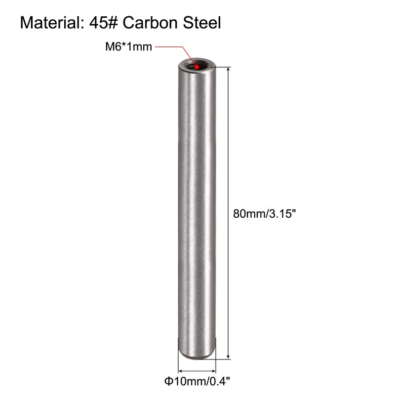 - Dowel Pin Size: 10x80 mm(D*H); Thread Dowel: M6*1 mm; Internal Thread Depth: 20 mm; Chamfered For: 1.2 mm; Material: 45# Carbon Steel; Style: Beveled Flat