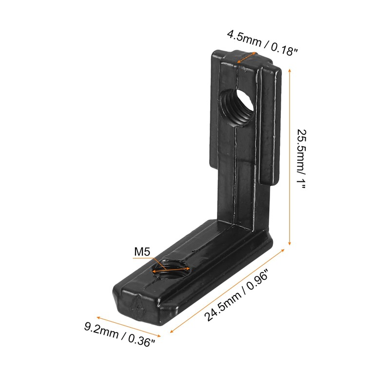 - [Inside Joint Connectors] - Thickness: 4.5mm / 4.5; Hole Quantity: 2; Hole Size: M5; Total Size: 25.5mm x 9.2mm x 24.5mm / 1 x 0.36 x 0.96 (L*W*H); Package Content: 4Pcsx Aluminum profile Angle Brackets