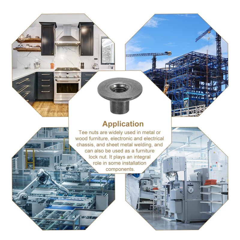 • Application: Tee nuts are widely used in metal or wood furniture, electronic and electrical chassis, and sheet metal welding, and can also be used as a furniture lock nut. It plays an integral role in some installation components.