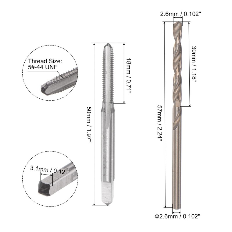 • Tap & Bit Set: Tap Size: Thread Size: 5#-44 UNF; Accuracy: 2B; Overall Length: 50mm Drill Bit Size: Cutting Edge Diameter: 2.6mm; Overall Length: 57mm