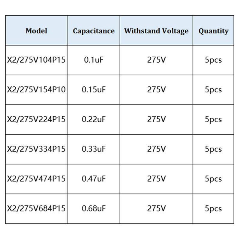 - Package Content: 30 Pcs (Each Model 5pcs) x Polypropylene Capacitors.