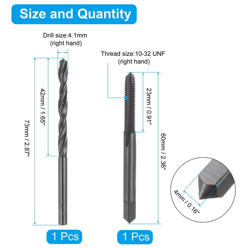 - Tap and Drill Bit Set: 1pcs 10-32 UNF (right hand) thread taps and 1pcs 4.1mm (right hand) drill bit. 6542 (M2) high speed steel screw tap & drill bit set offers high hardness, good toughness, excellent wear and heat resistance for durability, and good cutting performance for clean, precise holes.