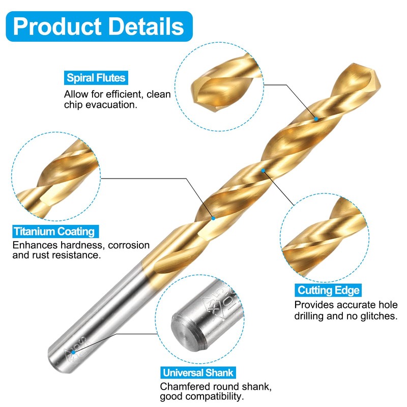 Twist drill bit adopts a spiral flute chip space design to remove chips quickly and cleanly. Cutting edges provide neat and smooth cuts. Use an appropriate lubricant (such as cutting fluid or oil) to reduce friction and heat build-up.
