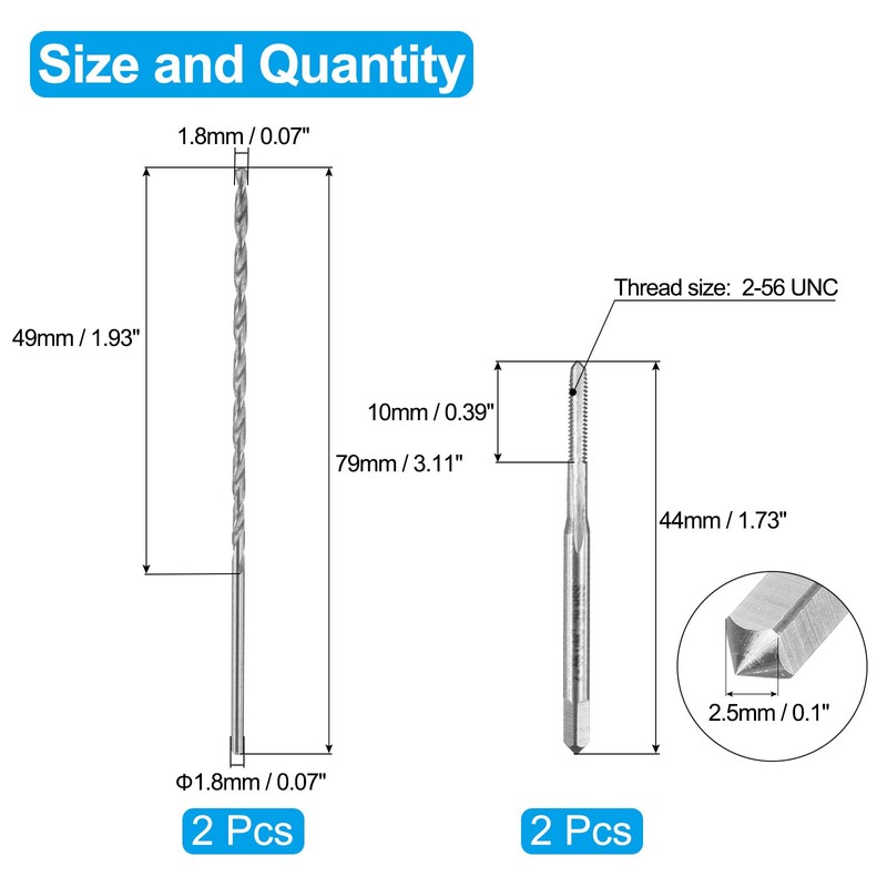 - Tap and Drill Bit Set: 2pcs 2-56 UNC (right hand) thread taps and 2pcs 1.8mm (right hand) drill bit. 6542 (M2) high speed steel screw tap & drill bit set offers high hardness, good toughness, excellent wear and heat resistance for durability, and good cutting performance for clean, precise holes.