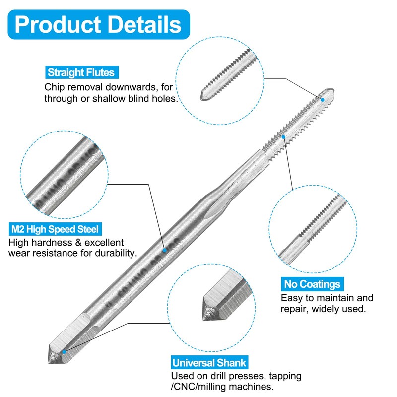 Descriptions:Thread tap adopts straight flute design, with clear threads and no burrs. Screw threading tap provides downward chip removal, fast and precise tapping, suitable for through holes or shallow blind holes.