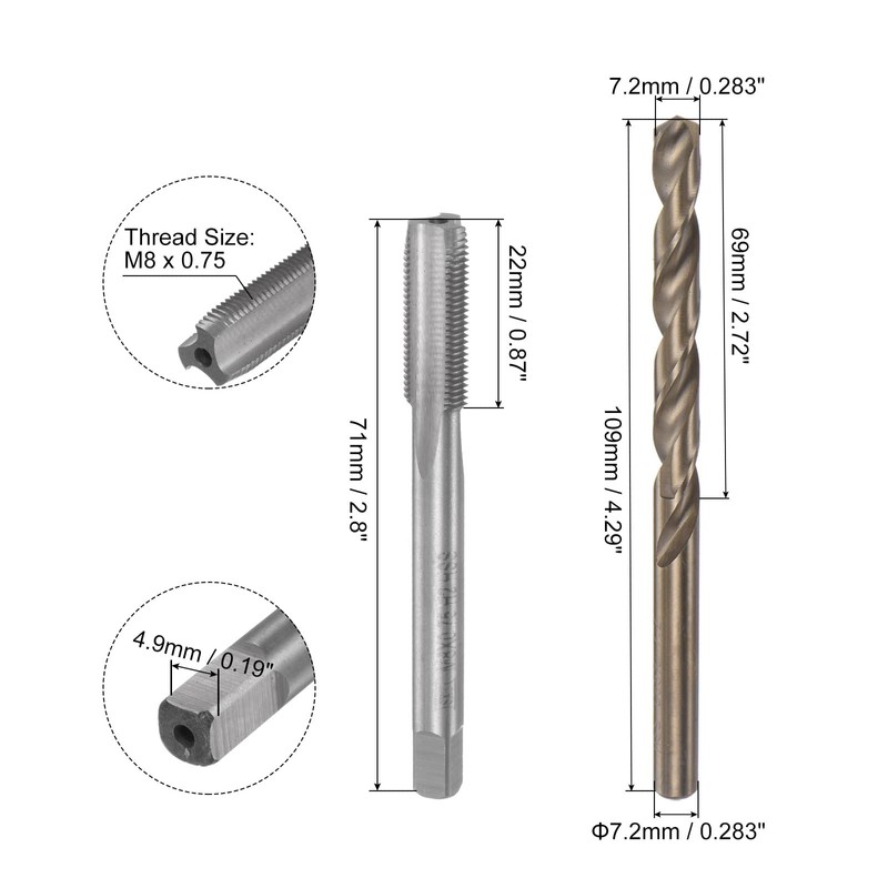 - Tap & Bit Sets: Tap size: thread size: M8 x 0.75; accuracy: H2; total length: 71mm / 2.8". Drill bit size: cutting edge diameter: 7.2mm / 0.283"; total length: 109mm / 4.29".
