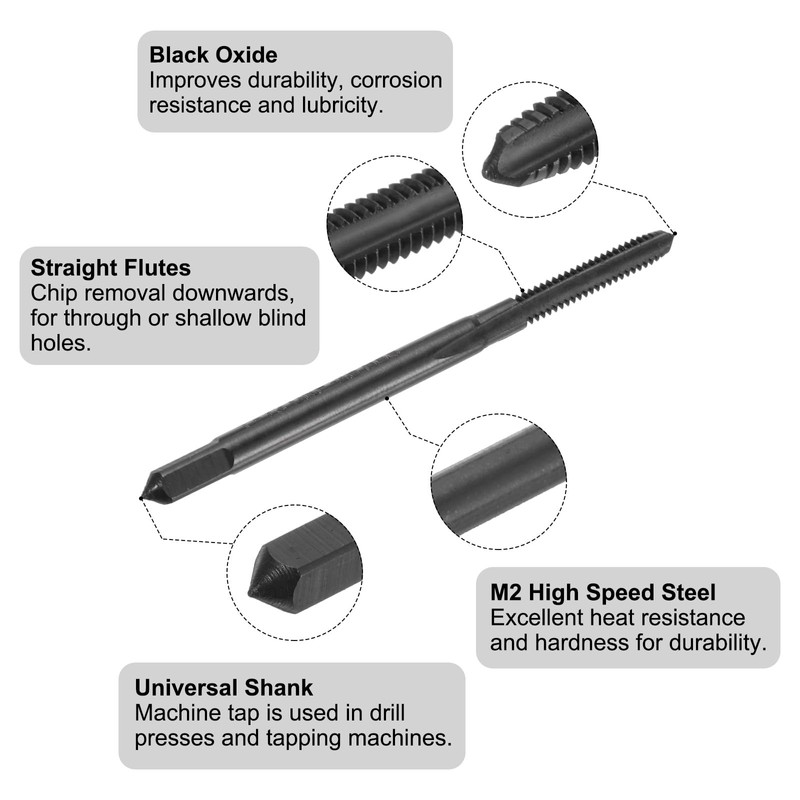 Thread tap adopts straight flute design, with clear threads and no burrs. Screw tap provides downward chip removal, fast and precise tapping, suitable for through holes or shallow blind holes. Machine tap is used in drill presses, tapping, CNC and milling machines. Not recommended for hand use and electric drill tapping.