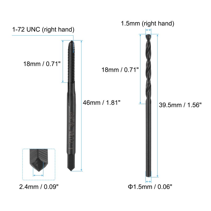- Tap & Drill Bit Set: Tap thread size: 1-72 UNC (right hand); twist drill bit size: 1.5mm (right hand). 6542 (M2) high speed steel tap and drill bit set offers excellent heat resistance and hardness for durability and longevity, and good cutting performance for clean, precise holes.