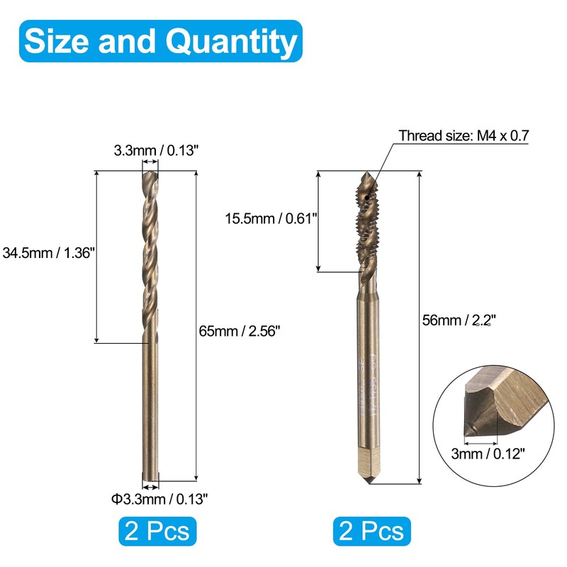 - Tap & Drill Bit Set: 2 pcs M4 x 0.7 (right wound) screw taps and 2 pcs 3.3mm (right wound) drill bits M35 Cobalt High Speed Steel Tap & Drill Bit Set provides improved hardness, abrasion resistance, cutting performance and high strength