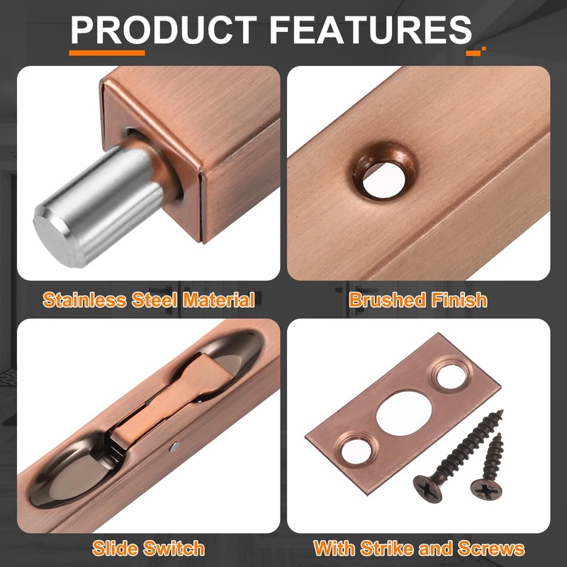 uxcell uxcell Door Bolts Latch 10 Inch, Stainless Steel Security Door Guard Lever Action Flush Slide Lock for Inactive Leaf, Double Dummy Door, Red Bronze