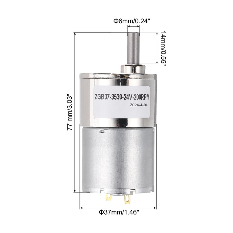 - Model: ZGB37-3530; Rated Voltage: DC 24V; No-load Speed: 200RPM (±10%)