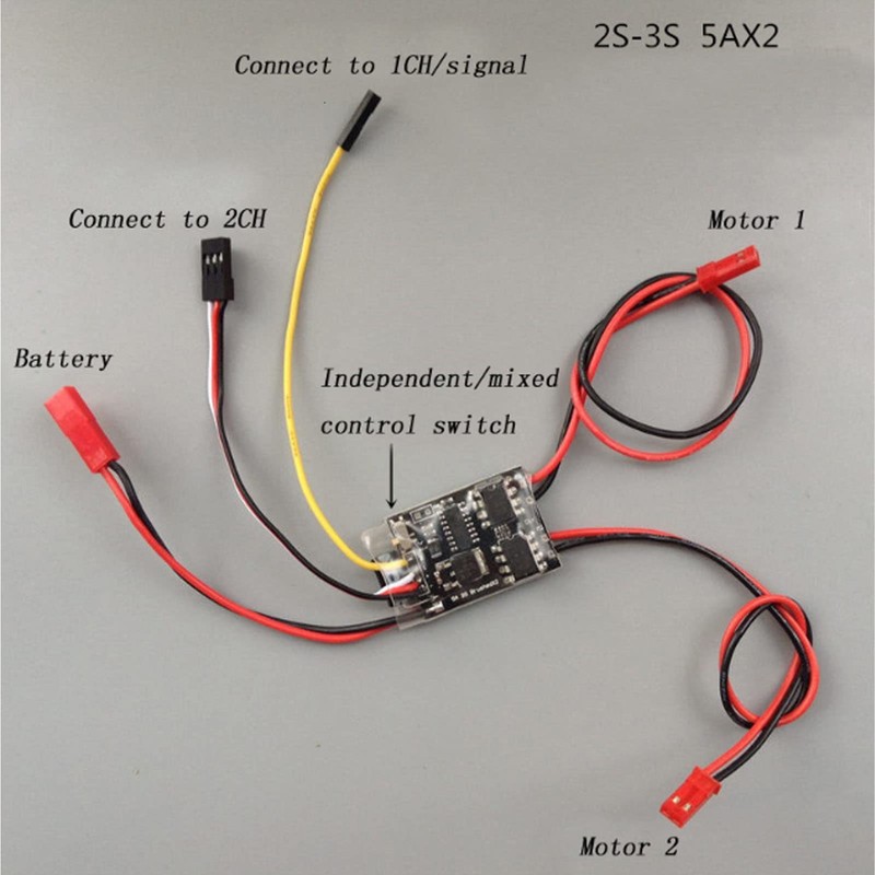 - [Practical]: This RC brushed ESC can adjust the differential rotation of the two motors, or control the forward and reverse rotations of the two motors respectively. In the hybrid control mode, dual motor differential capsizes, dump trucks, crawler vehicles, etc. can be made.