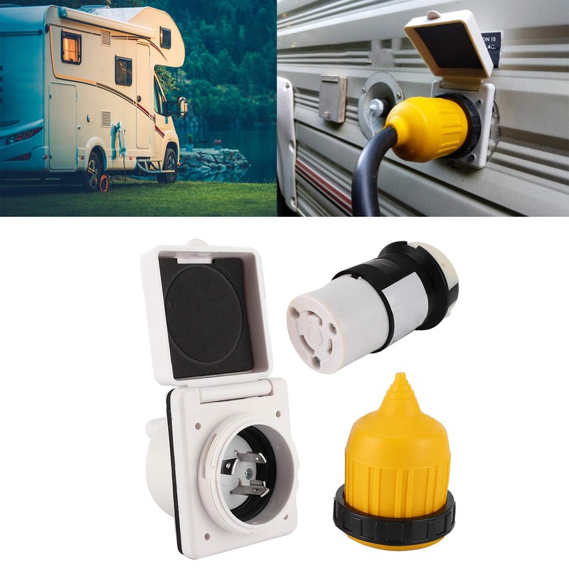 - Juego de conector y toma de corriente para vehículos recreativos, que incluye toma de corriente de 30 A (blanca), conector del extremo del cable y capuchón Twist Lock.