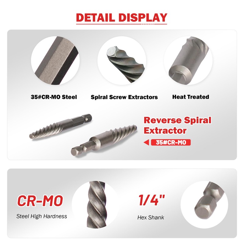 - ★ Easy to Use - Simple steps to remove all stuck screws or bolts in a few seconds. Step One to choose a smaller than the damaged screw, Step Two to use the same size extractor to take out reversely use your electric hand drills in low speed avoid getting hurt.