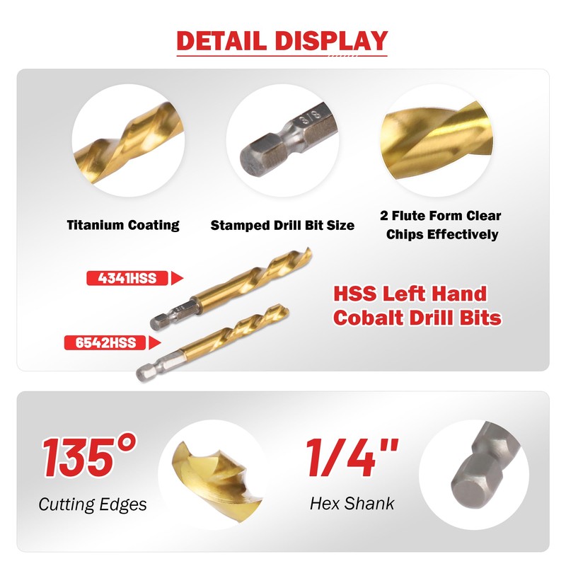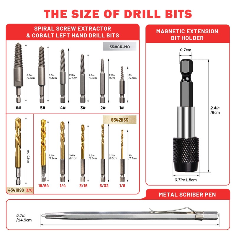 - ★ 14 PCS Screw Extractor Set - Spiral Screw Extractor:1#, 2#, 3#, 4#, 5#, 6#. Cobalt Left Hand Drill Bits Set: 1/8", 5/32", 3/16",1/4", 19/64", 3/8". Besides, there is an extra 1/4" adapter to extend the drill interface. And a Tungsten Carbide Tip Scriber Pen which is an ideal tool for hardened materials cutting, such as metal sheet/Glass/Ceramics/wood, etc