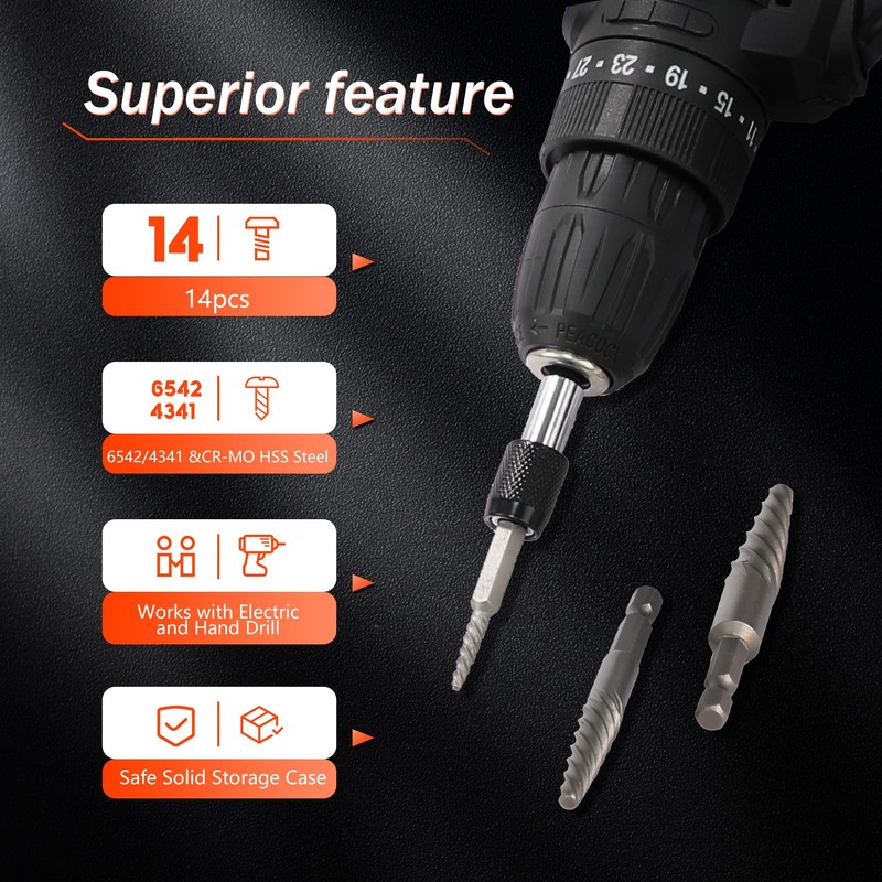 - ★ Durability - Made of impact-resistant 4341/6542 HSS steel, screw extractor made of high-quality cr-mo steel, which increases durability and service life. It's built to last and is designed to be harder, tougher, and easier to drill, greatly increasing service life. Also, comes with a storage tool box to ensure you will not lose any one of them. What's more, you can take it anywhere with you.
