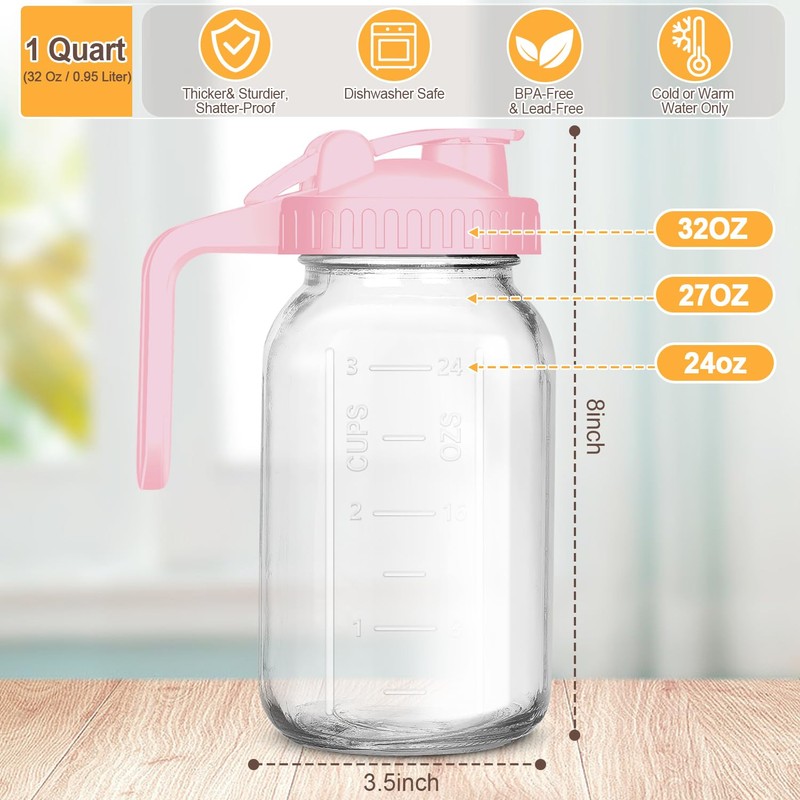 UYEIKMLOP Mason Jar Pitcher, 32 OZ Breast Milk Pitcher Double Leak Proof with Pour Spout Handle, Wide Mouth Iced Tea Pitcher for Fridge, Creamer Container for Coffee, Sun Tea juice (Pink,1 Pack)