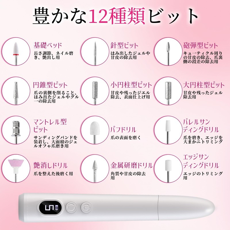 - 【専用ビット12種類!多機能ネイルマシン!】多機能ネイルマシンは専用ビット12個とサンディングバンド5個を付属し、爪の下準備、カット、ジェルオフ、甘皮処理、長さ/厚み/先端の形整え、つや出しなど、これ一つですべて対応できます。日本語説明書付き、ビットを付け替えもスムーズに、自宅で手軽くにネイルチェンジを楽しめます。
