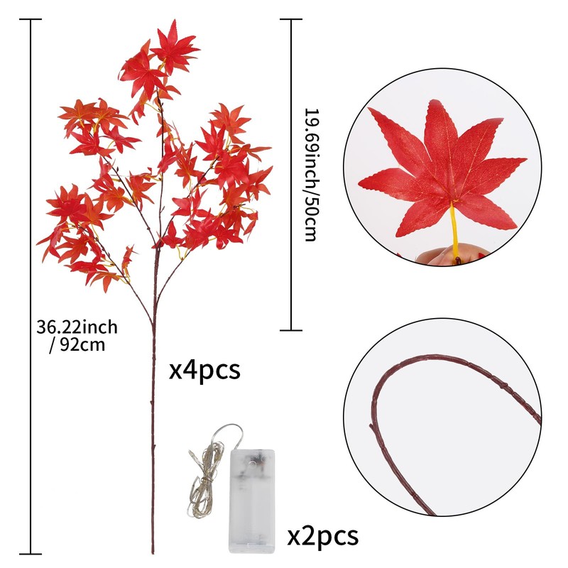 - Packaging and Size:You will receive 4 pcs artificial maple branches and 2 pcs light strings, each fake maple branch is about 92cm/36.22inches long. Because the maple leaf branches are too long, we will bend the branches for the convenience of packaging. After receiving the fake maple leaves, you can easily straighten the maple leaf branches by hand and adjust autumn branches to the shape you want