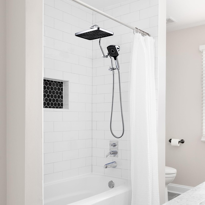 The unique extended shower arm is adjusted to the highest level to avoid collision with the rainfall shower. The extended diverter with holder is easy to adjust the mode and reach the handheld shower, and there is no need to attach the holder to the wall. The hose can be stretched from 60 to 65 inches. The power wash mode on the top of the handheld shower with 65-inch stainless steel hose can better clean the corners of the shower easily and quickly. Easy to install, the box has all the tools needed for installation, you can easily do it yourself at home, no need to hire a plumber. Enjoy your shower to the fullest with this shower combo!