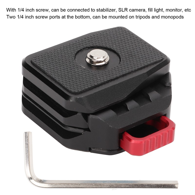 1、Aluminum Alloy Material: V lock quick release plate is made of aluminum alloy material, durable, light and compact, easy to store and carry. 2、V Mount Design: The V mount design can be used to install most V mount batteries, providing a long battery life for the camera through the battery. 3、Anti Slip Rubber Pad: The quick release plate has a non slip rubber pad on the top to prevent the device from scratching. 4、Scope of Application: With 1/4 inch screw, V lock quick release plate can be connected to stabilizer, SLR camera, fill light, monitor, etc. Two 1/4 inch screw ports at the bottom, can be mounted on tripods and monopods. 5、Quick Release Button: Through the red quick release button, the device can be quickly locked and removed, safe, stable and convenient