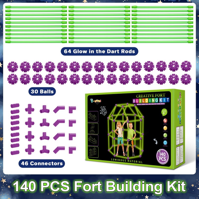 - Complete 140 Pcs Glow Fort Building Toys - The fort kit comes with 64 pcs long rods(Glow in the dart), 30 pcs durable connector balls, 46 pcs connectors contains 4 pcs 4 channel connectors, 16 pcs 3 channel conntectors and 26 pcs 2 channel connectors(Contains 3 different angles). The enough quantity allows children to build castles of various shapes.