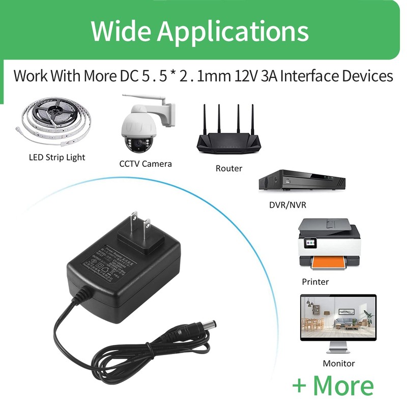 • Input Voltage: 100-240V 50/60Hz 1AMax DC Output: 12V 3A 36W