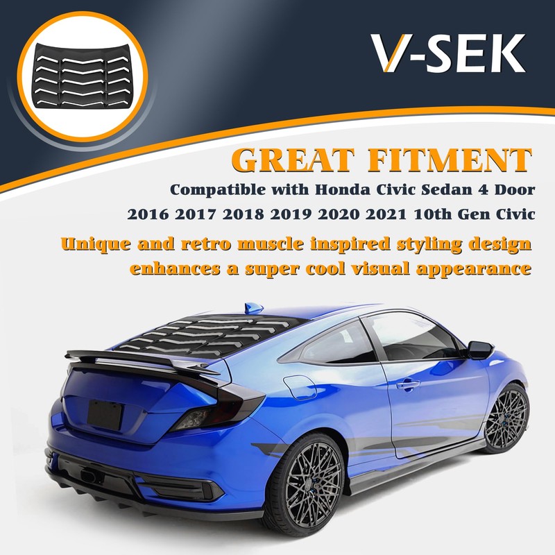 V-SEK Rear Window Louver Compatible with Civic Sedan 4 Door 2016 2017 2018 2019 2020 2021 10th Gen Windshield Sun Shade Cover in GT Lambo Style ABS Matte Black