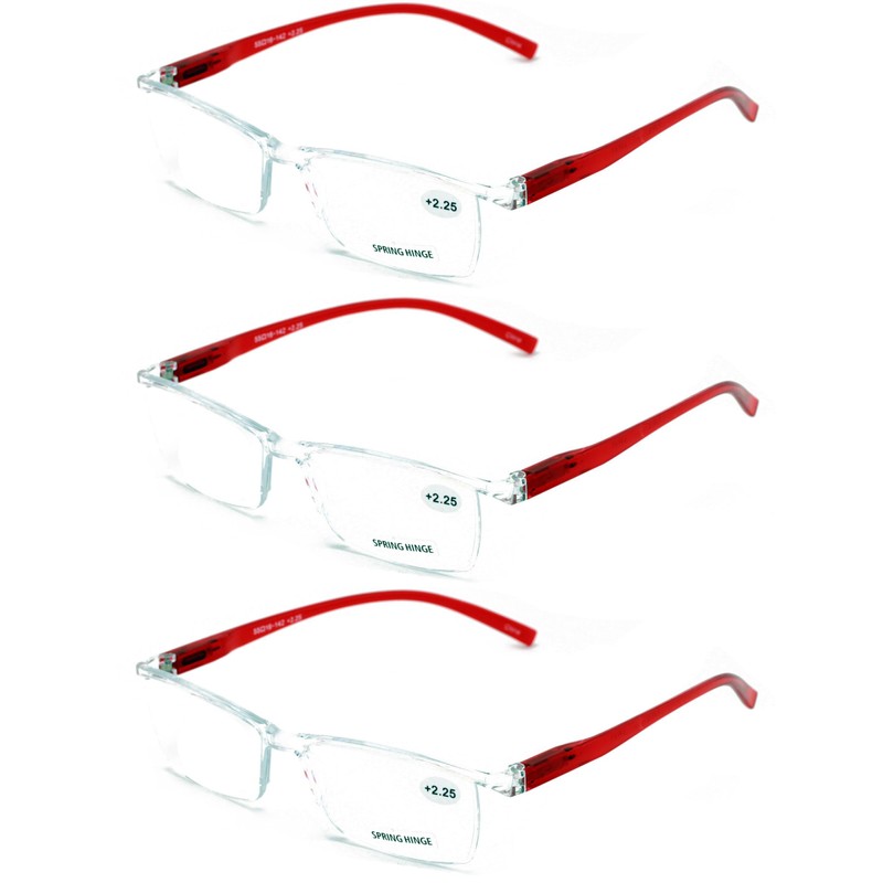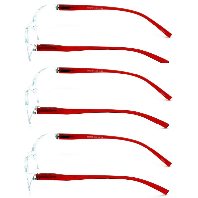 V.W.E. 3 Pairs Lightweight Comfortable Transparent Frame Clear Rectangular Readers Reading Glasses - Men Women (3 Red, 1.75, x)