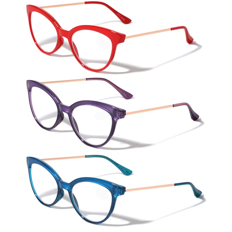 V.W.E. 3 Pairs Women Cateye Pointed Tip Reading Glasses - Metal Temple Cat Eye Readers (Red Purple Blue, 1.75)
