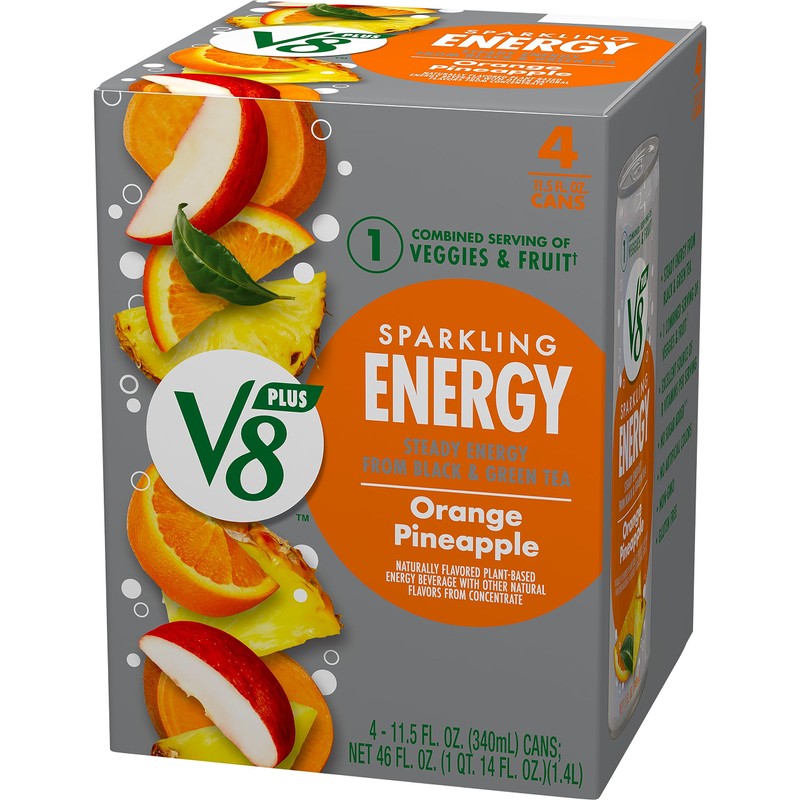 - Fruit Flavored Energy Drinks: Four (4) 11.5 fl oz cans of V8 +SPARKLING ENERGY Orange Pineapple Energy Drink