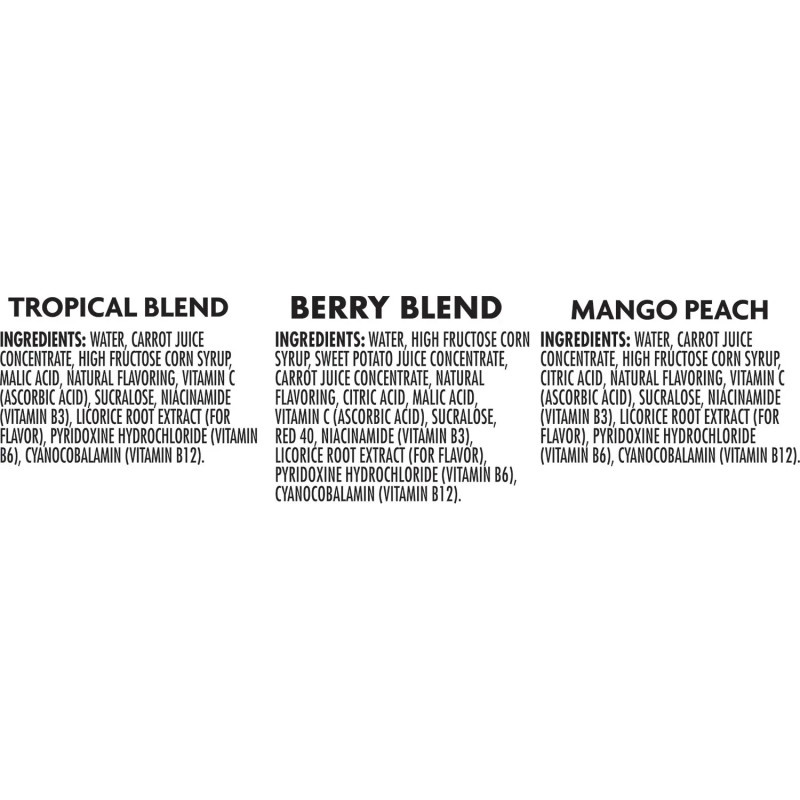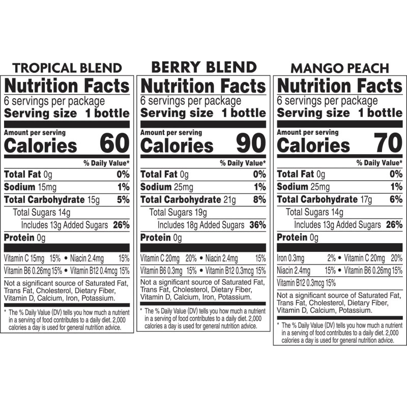 Package includes 18, 12 oz. bottles— try all three varieties! Berry Blend, Mango Peach, Tropical Blend