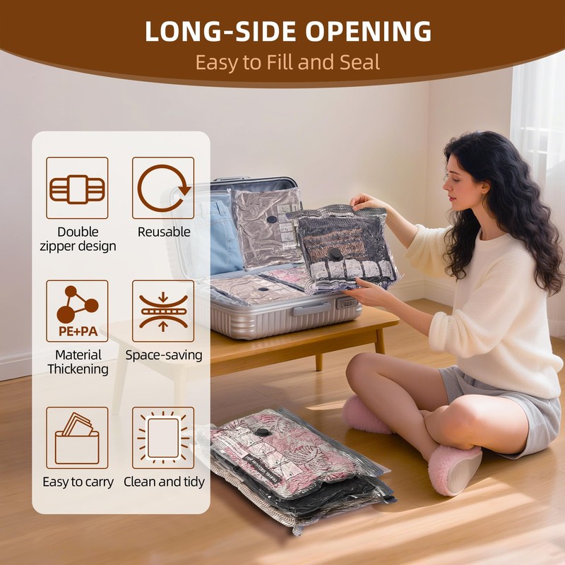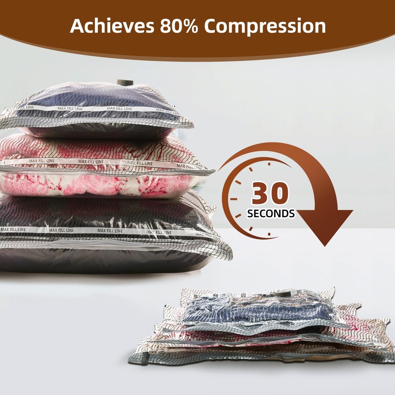 - 80% Space Save Bags: Easy to use 1.Pack; 2.Seal; 3.Vacuum(NO PUMP), maximize luggage space for travel or seasonal storage. Ideal for both room organization and maximizing suitcase space, these bags transform cluttered areas into tidy, spacious zones, making them essential for vacuum seal bags for clothing.